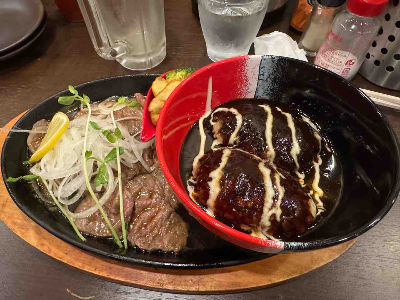 ここのレモンステーキとハンバーグのセット。