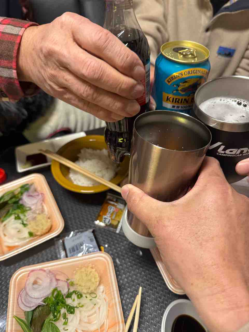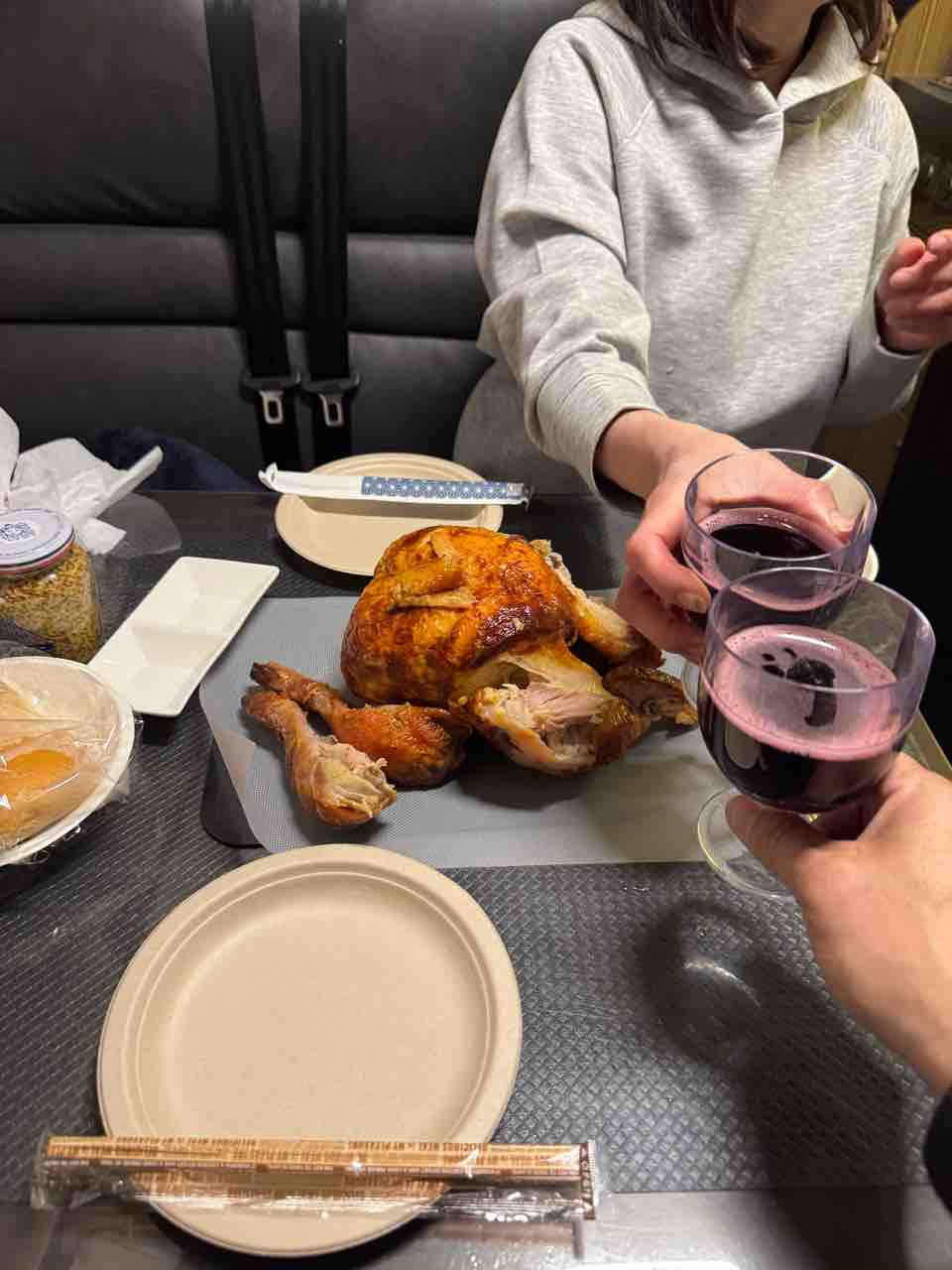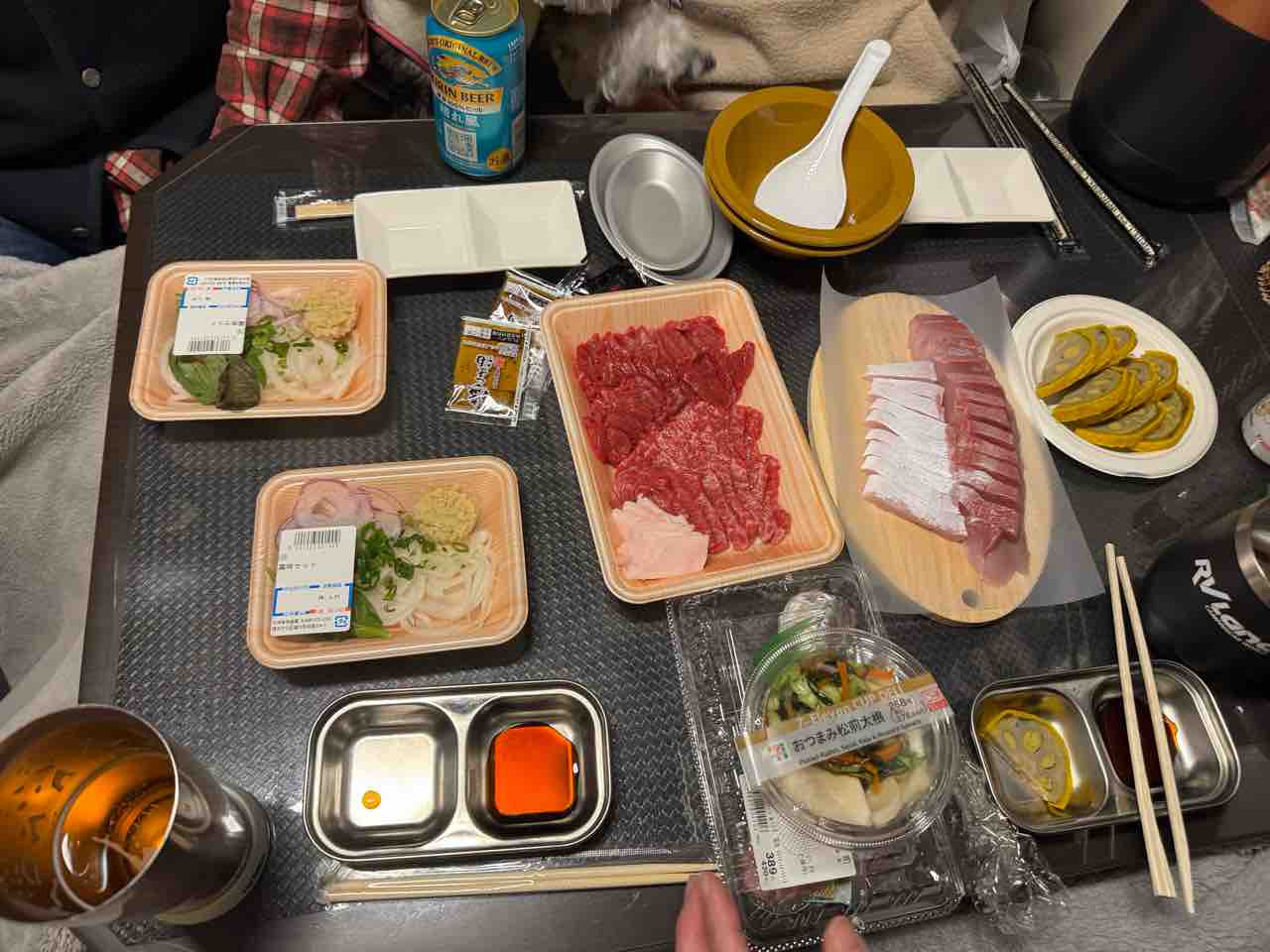 コストコで買った食材で乾杯。すでに遅くなっていたので、