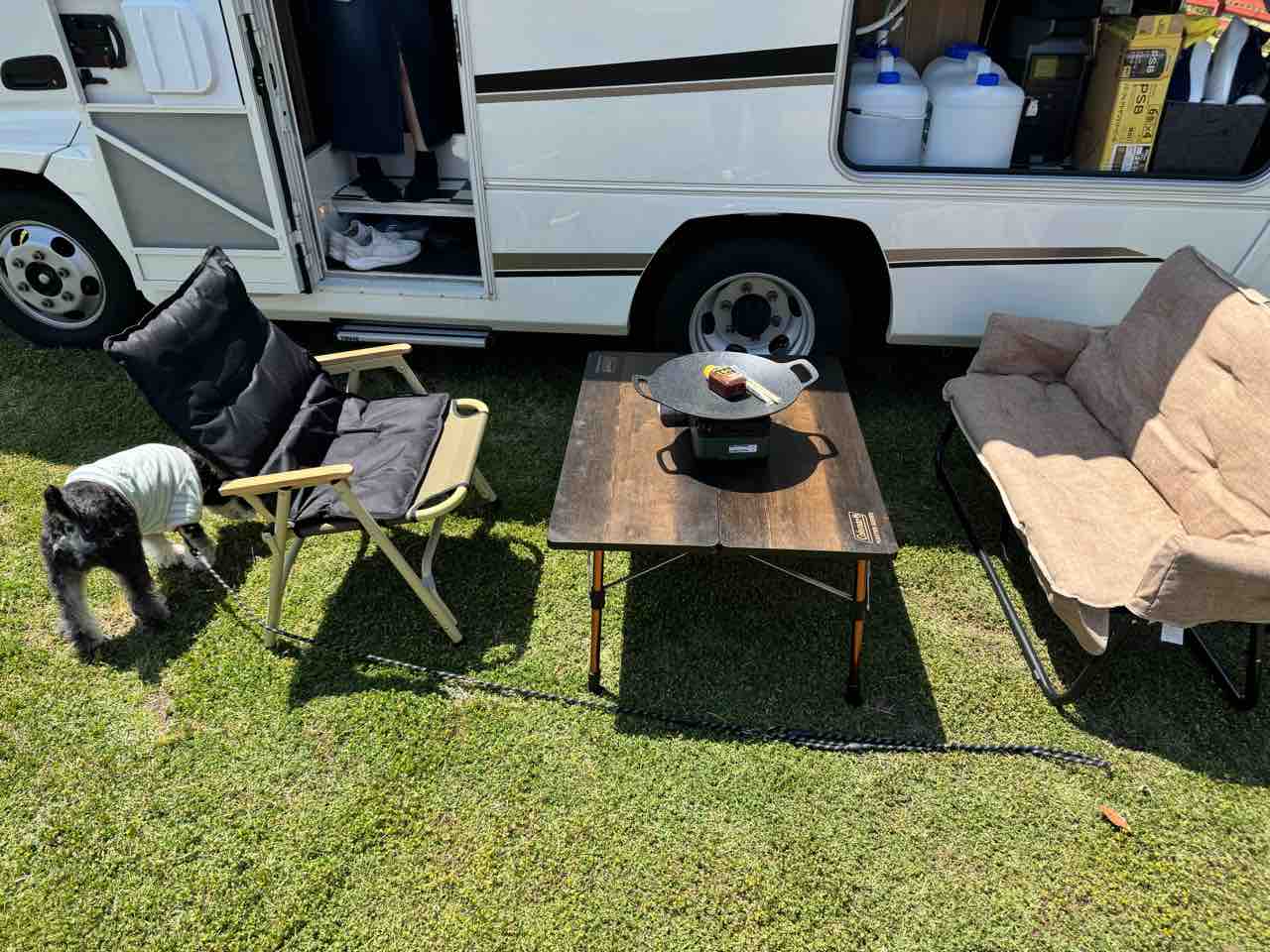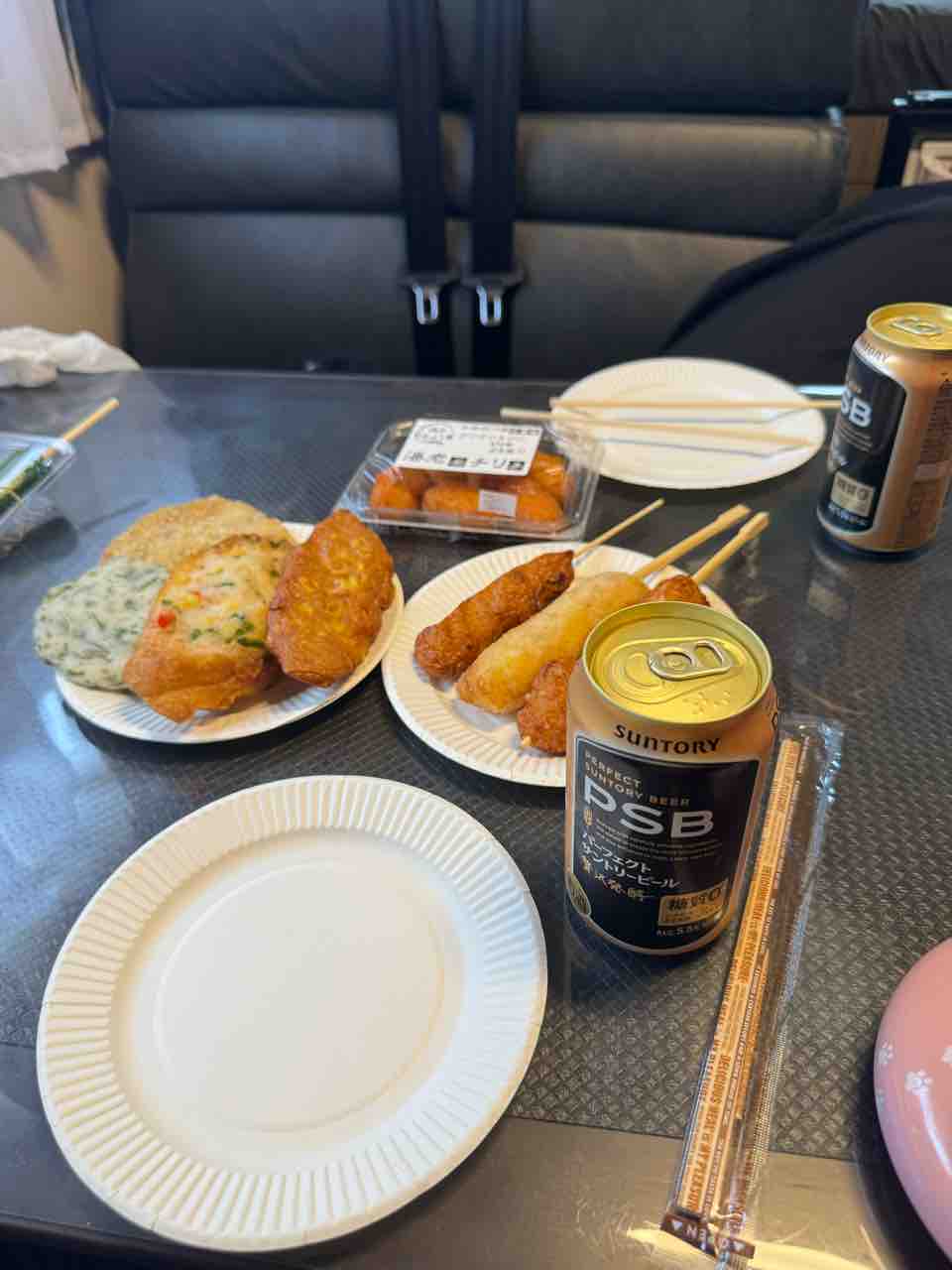 外は土砂降りの雨なので、チェックイン早々に車内で宴会開始。
